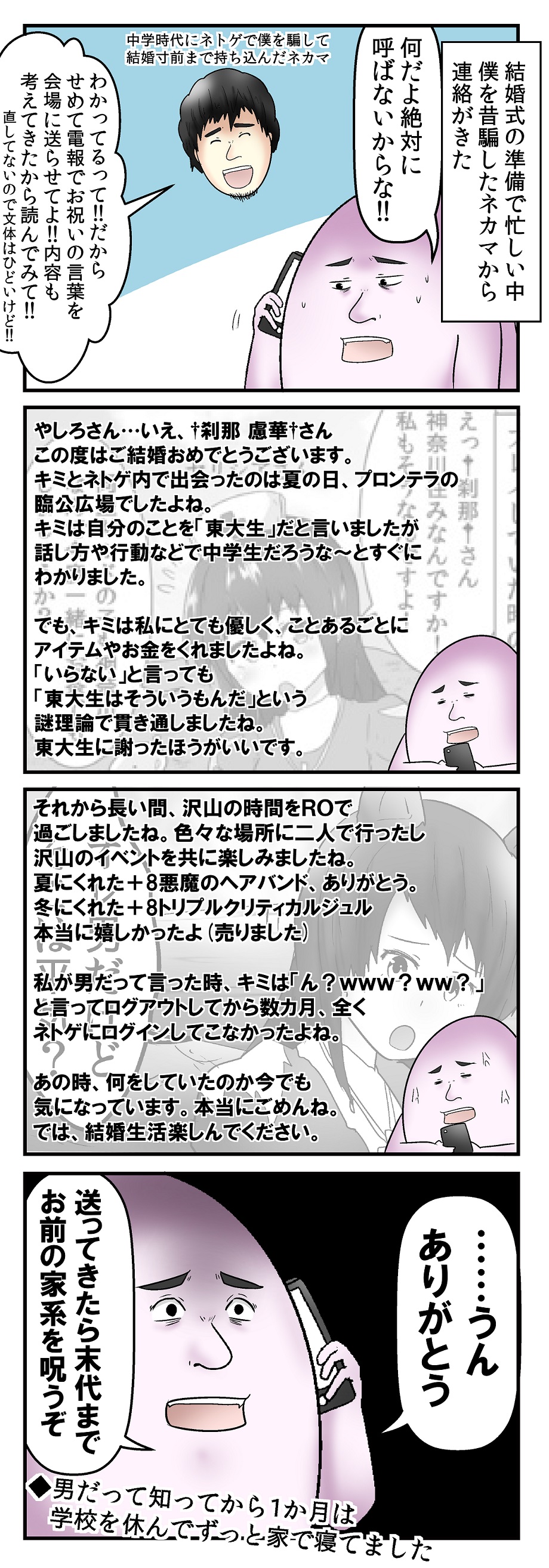 2018年07月21日 僕と結婚式の話② 「日常漫画」カテゴリの最新記事 タグ :#やしろあずき#4コマ 前の記事僕の三角コーンが社会を巡っている話 次の記事僕と通知の話 コメント コメント一覧 (19) 1. 四角コーン 2018年07月21日 12:33 †cecilia†キタ━━━━(゚∀゚)━━━━ッ!! この前の記事の続きですね!素敵な電報です! 中学時代から1ヶ月ネトゲを理由に寝込んで学校を休めるやしろ先生はやっぱり凄い…… 2. きゃすか 2018年07月21日 12:53 コメント読んでくれるかなー? 大好きだよー! 3. 十角コーンツボ押し健康法 2018年07月21日 14:50 悪魔のヘアバンドってそんなに入手困難なやつなのかちょっとPSO2で例えてくれない? 4. ねなべ 2018年07月21日 15:23 †cecilia†シリーズめっちゃすこ 5. 名無しのあずき 2018年07月21日 16:23 ある意味東大生だったよね。 「東京工科大学」 6. もっちり 2018年07月21日 16:24 よく休めましたよね....💧 7. しろたにすと 2018年07月21日 23:03 売りましたwww 売るなよwww 8. こきふり 2018年07月22日 13:06 面白いなこの人!www やしろさん、面白くて変な人によく出会いますねーもはや才能ですね。 9. しろ 2018年07月22日 14:14 やしろさん大好きです。 10. ろ 2018年07月27日 14:00 米3 PSO2は存じ上げませんが… サーバー内に2匹だけ2時間ごとに出現するレアモンスターが1%でドロップします。 一日中マップに張り付いて走ってる多数のプレイヤーとこいつを奪い合います。 強化しまくると約5%の確率で+8が出来ます。強化にも素材と費用がかかり、失敗時は装備ごと消滅するので大量に必要です。 ガチ性能という程の装備ではなく見た目と希少性で高かった装備なので、成金が姫に貢ぐための強化ですね。 +8TCJが価値ある時期だとこれで合ってると思います。 11. ろ 2018年07月30日 23:08 TCジュル売りましたで大草原不可避 12. ななし 2018年10月04日 19:02 えぇー…性別詐称はダメで学歴詐称はいいのー…? しかも「いらない」って言われてるのに無理やり押し付けてるんじゃん… ていうかそもそも女ってだけで貢ぐとか 会ったこともない人好きになるとか何? 会話が楽しくて気が合ったなら別に男でもいいじゃん… 13. kei 2019年01月17日 23:52 大爆笑!!ラグナロクやってたなぁ。プロンテラくそ懐かしい。 14. 2019年04月09日 11:18 ※12 ネカマに釣られる奴ってそういうもんなんだよ 実際マジで出会い系と勘違いしてるような奴もいる 15. なまや 2019年05月29日 16:04 三コマ目の後ろの絵でセシリアはなんて言ってんの? 16. 2019年05月29日 16:40 ※15 「オレ男だけど そこは平気?」だと思う たぶんオフ会でも持ちかけたんだろう 17. Eterna 2019年05月29日 17:10 RO懐かしすぎてワロタ。 あの頃は自分も色々と痛かったので、 やしろさんの内容が分かり過ぎて笑えます。 私もネカマと言えばネカマで 聞かれれば中の人は男と普通に言う殴りプリーストでした。 18. 2019年05月29日 20:01 †やしろ†さん東大生を名乗ってたのかい 19. ファイナルアラーン 2020年05月09日 13:34 絶対結婚すると誓ったこともある人なのに扱いひどいと思います コメントフォーム 名前 コメント 記事の評価 リセット リセット 顔 星 情報を記憶 コメントを投稿する