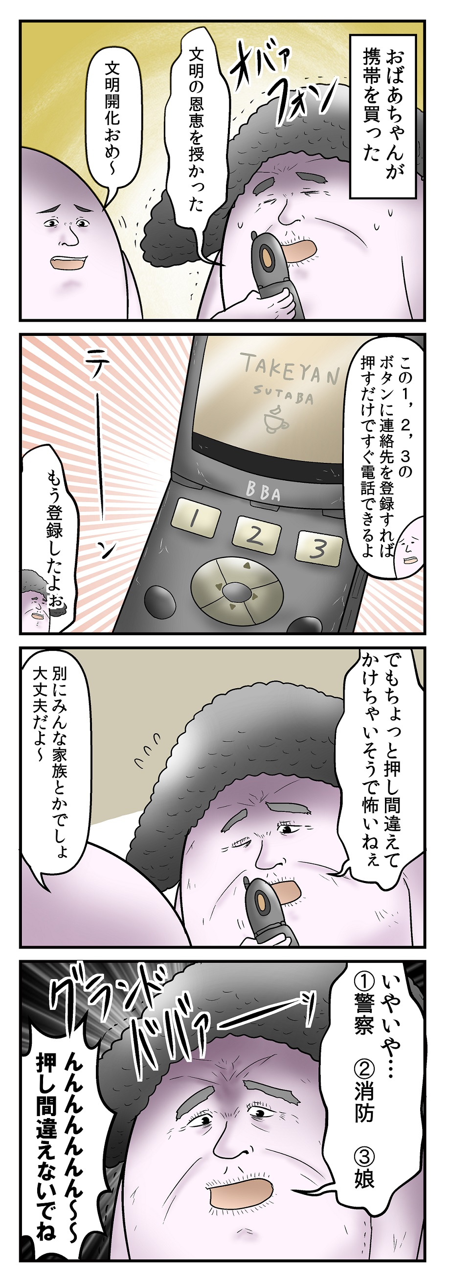 2018年09月26日 僕とおばあちゃんと携帯電話の話 いつ国家機関を呼ばれるかハラハラした携帯も数年たった今では文鎮になっています 「ババアと家族漫画」カテゴリの最新記事 タグ :#やしろあずき#4コマ 前の記事母親と自動更新の話 次の記事母親とゲーム友達の話 コメント コメント一覧 (10) 1. うぉんおん 2018年09月26日 12:36 オバフォンいいww 前に子供が赤ん坊のときに勝手にかけた先が海上保安庁の音声ダイヤルだったことを思い出しました。 あのときはすみませんでした。 2. こきふり 2018年09月26日 12:54 相手先が押し並べてド安心w 3. s 2018年09月26日 12:57 前見た漫画 4. みみもん 2018年09月26日 14:24 ばぁちゃんも面白かったw 5. 名無し 2018年09月26日 14:32 >3 最近多いよね 6. 究極七原 2018年09月27日 04:24 画面がたけやんスタバw 7. 月影 2019年01月12日 15:03 TAKEYAN(sutaba)草 8. のなめ 2019年01月12日 15:05 最後のコメ草 9. 読者に代わりまして名無しがお送りします(gauod53k) 2019年01月12日 16:03 文明の恩恵の連絡先とんでもなくて草 10. 名無しさんファミリー 2019年09月04日 13:15 文www鎮wwwww ハライテー コメントフォーム 名前 コメント 記事の評価 リセット リセット 顔 星 情報を記憶 コメントを投稿する