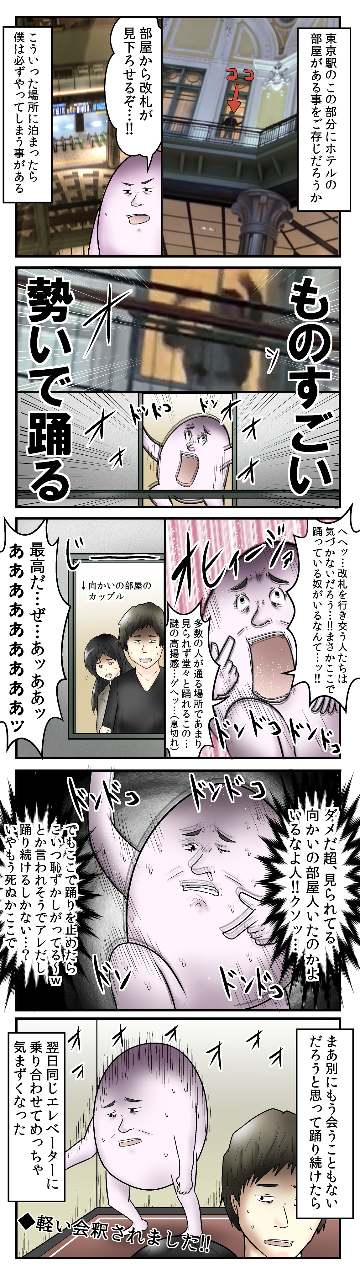 2018年10月23日 僕と東京駅のホテルの話 この後朝食も隣の席で「ダンサーなんですか?w」って聞かれ恥ずかしさの余りつい「はい」って答えちゃったけど嘘ついてごめんなさい。ダンサーな訳ないだろ。 ホテルはこちら 東京駅ステーションホテル 「日常漫画」カテゴリの最新記事 タグ :#やしろあずき#4コマ 前の記事母親とフォールアウト4の話 次の記事外向きの母親と素のババァの話 コメント コメント一覧 (42) 1. 3角コーンになりたい 2018年10月23日 12:08 席まで近かったんですかww しかも話しかけられてるw 副業ダンサーにしておけば、オッケーだと思います! 0 やしろあずき がしました 2. 名無し 2018年10月23日 12:09 もはや東京駅の妖精 0 やしろあずき がしました 3. 名無し 2018年10月23日 12:29 何故自分と同じ様に窓から覗いてる人が居ると考えなかった…w 0 やしろあずき がしました 4. こきふり 2018年10月23日 12:46 待ってましたwwwwww 歩く伝説製造機wwwwww 0 やしろあずき がしました 5. 妖怪小豆洗い 2018年10月23日 13:56 そういや、YouTubeに上がってたね。 ディズニーのホテルで踊り狂うやしろあずき。 0 やしろあずき がしました 6. とんがりコーン 2018年10月23日 14:25 母に踊らされるマリオネット 0 やしろあずき がしました 7. 三角コーン 2018年10月23日 16:41 ダンサーなんですか? 0 やしろあずき がしました 8. ななしの 2018年10月23日 16:43 あのホテル結構高いのに、うらやましー! 内装とか泊まった感想とかホテルのサービスとか漫画にしてほしい 0 やしろあずき がしました 9. ナナシ 2018年10月23日 17:35 パナイッス 0 やしろあずき がしました 10. RI 2018年10月23日 17:44 クリスマスは、一泊💰60.000だよん 0 やしろあずき がしました 11. まさか 2018年10月23日 17:47 こんなブログをやってる人だったんですね。 ダンサーではないな、と薄々は思ってました。 0 やしろあずき がしました 12. 3角コーンになりたい 2018年10月23日 18:37 ↑ ?!まさか正体がバレたの?!wwwww 0 やしろあずき がしました 13. +セリシア+ 2018年10月23日 18:52 いやそもそもなんで踊るという発想にいたって行動するの? 0 やしろあずき がしました 14. 黄色い三角コーン 2018年10月23日 19:10 ウケる 0 やしろあずき がしました 15. 名無しさん 2018年10月23日 19:10 レポートしないのが、このブログの良いところ。 0 やしろあずき がしました 16. コ 2018年10月23日 20:36 多分向こうも困ったでしょうねw 0 やしろあずき がしました 17. としあき 2018年10月23日 21:56 つべにはアップされてないんですか? 0 やしろあずき がしました 18. 餅 2018年10月24日 00:16 シンプルに辛いな… 0 やしろあずき がしました 19. 2018年10月24日 10:05 これもう営業妨害だろ 0 やしろあずき がしました 20. サンバ暮コーン 2018年10月24日 12:20 踊ることでネタに繋がり収入にも繋がる→踊りで生計を立てている→ダンサー 間違いないからこれからも胸を張って踊り続けてください。 0 やしろあずき がしました 21. わんこ 2018年10月25日 00:24 漫画家兼ダンサー兼お笑い芸人 0 やしろあずき がしました 22. あん 2018年10月25日 02:03 昔駅でバイトしたら中に入れたりして楽しかった 0 やしろあずき がしました 23. ぽぽ 2018年10月25日 03:32 こういうの見られた時にやめると恥ずかしいだけだから逆にやり通すのは正解だと思うけど 次の日会っちゃったら流石にもう詰みだなー 0 やしろあずき がしました 24. No Name 2018年10月25日 15:51 普通に下の階の人にキレられそうですね 0 やしろあずき がしました 25. 例のアレ 2018年10月27日 20:29 2コマ目がウッチャンナンチャン南原つまらないに見えた、訴訟 0 やしろあずき がしました 26. 見上げてみれば 2019年02月06日 00:49 もしかしてディズニーでも踊っていましたか 0 やしろあずき がしました 27. 名無し 2019年02月06日 07:46 「ダンサーなんですか?」 「いいえ妖怪カラーコーンです」 0 やしろあずき がしました 28. じんたん 2019年02月06日 10:26 職場の近くでこんな面白い人が踊ってたなんてなー 見に行けばよかったw 0 やしろあずき がしました 29. なめこ 2019年02月06日 10:30 「ダンサーなわけないだろ」 で、腹筋崩壊しました!!!! 嬉しかったら、踊るのが人間の本能……wwwwww 0 やしろあずき がしました 30. 下らん 2019年02月06日 14:41 気絶しそうなほど面白くない 0 やしろあずき がしました 31. 青い衣のコンビニ店員 2019年02月06日 16:54 やしろさぁーん。 やしろさんの踊ってる所に遭遇したいー 0 やしろあずき がしました 32. れーちゃん 2019年02月07日 18:37 以前、このホテルでSMしたのを思い出しました。あ、わたしが縛ったり、鞭で打ったりする人です。 0 やしろあずき がしました 33. hageてない 2019年03月12日 18:13 そんな激しく踊ると、また三角コーンがケツに挿さりますよ。 0 やしろあずき がしました 34. くまろ 2019年03月12日 18:52 旅の恥はかきすてですね!どんまいヽ(´・∀・`)ノ 0 やしろあずき がしました 35. へべれけ 2019年04月10日 15:29 あれやっぱりやしろさんだったんですね 0 やしろあずき がしました 36. 通りすがりの一般市民 2019年04月10日 16:40 漫