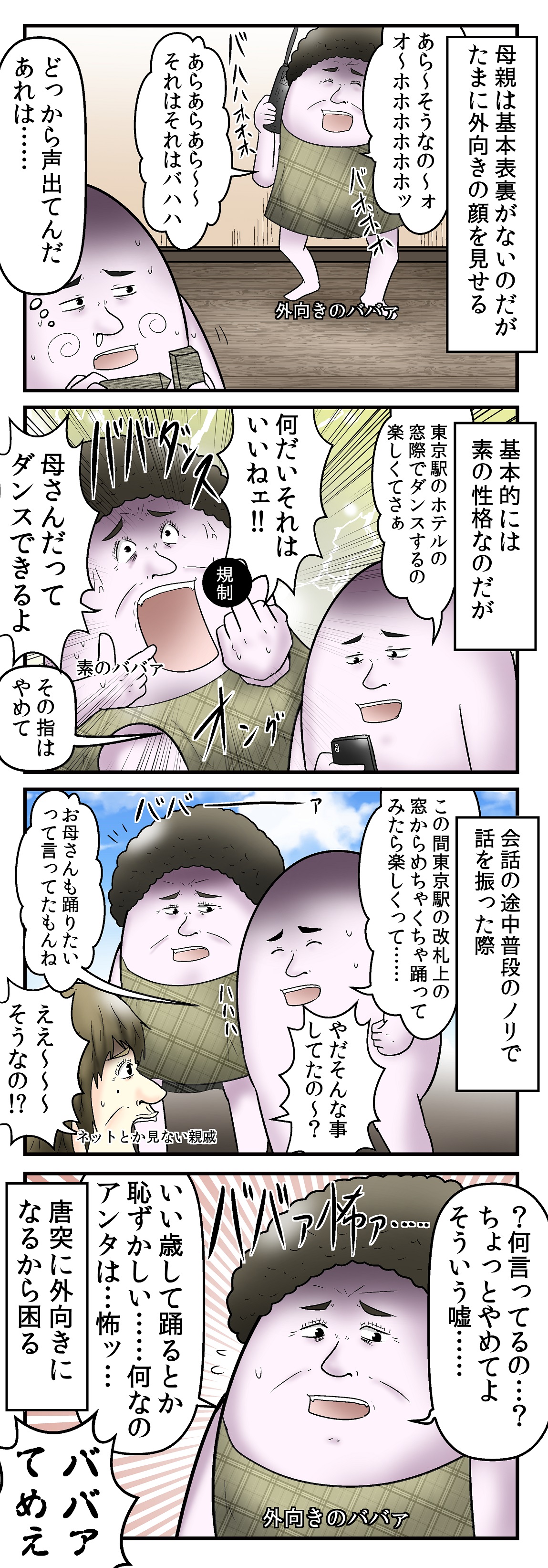 2018年10月24日 外向きの母親と素のババァの話 コミケやコミティアなどイベントに来てくださった方々に対応している母の姿は完全に「外向き」です 「ババアと家族漫画」カテゴリの最新記事 タグ :#やしろあずき#4コマ 前の記事僕と東京駅のホテルの話 次の記事僕とコーンと最近の依頼の話 コメント コメント一覧 (10) 1. にーと 2018年10月24日 12:13 内向きがそんなキャラクターのお母さん羨ましい 0 やしろあずき がしました 2. 、 2018年10月24日 12:15 DBD実況のババア氏も外向きなんかな? 0 やしろあずき がしました 3. 辛ぁ〜コーン 2018年10月24日 12:19 内向きは実況動画でいくらでも聞けそうww 0 やしろあずき がしました 4. ぎんなん 2018年10月24日 12:21 ツイッターでの言動も外向きなんですか? 0 やしろあずき がしました 5. り 2018年10月24日 17:33 最初のバハハホホホで吹きそうになって危なかった。人がいる前で見るんじゃなかった 0 やしろあずき がしました 6. 紅蓮の円錐塔 2018年10月24日 20:46 程度の違いはあれど、世の母親はこういうとこあるよなw まあでも人選んで暴露しないであげるのが大人やね 0 やしろあずき がしました 7. 根尾 2019年03月23日 21:36 こういう切り替えってミスらないのかね? 最近やっと自分も猫を被る事を学び始めたけど…切り替えがすぐに出来ない(^o^) 0 やしろあずき がしました 8. にゃあ 2019年03月23日 23:02 にゃあ 0 やしろあずき がしました 9. 面白いけど 2019年03月26日 14:55 なんだか下品な家庭だね 0 やしろあずき がしました 10. 馴れ初めマン 2019年12月28日 15:20 馴れ初め聞かせてください! 0 やしろあずき がしました コメントフォーム 名前 コメント 記事の評価 リセット リセット 顔 星 情報を記憶 コメントを投稿する