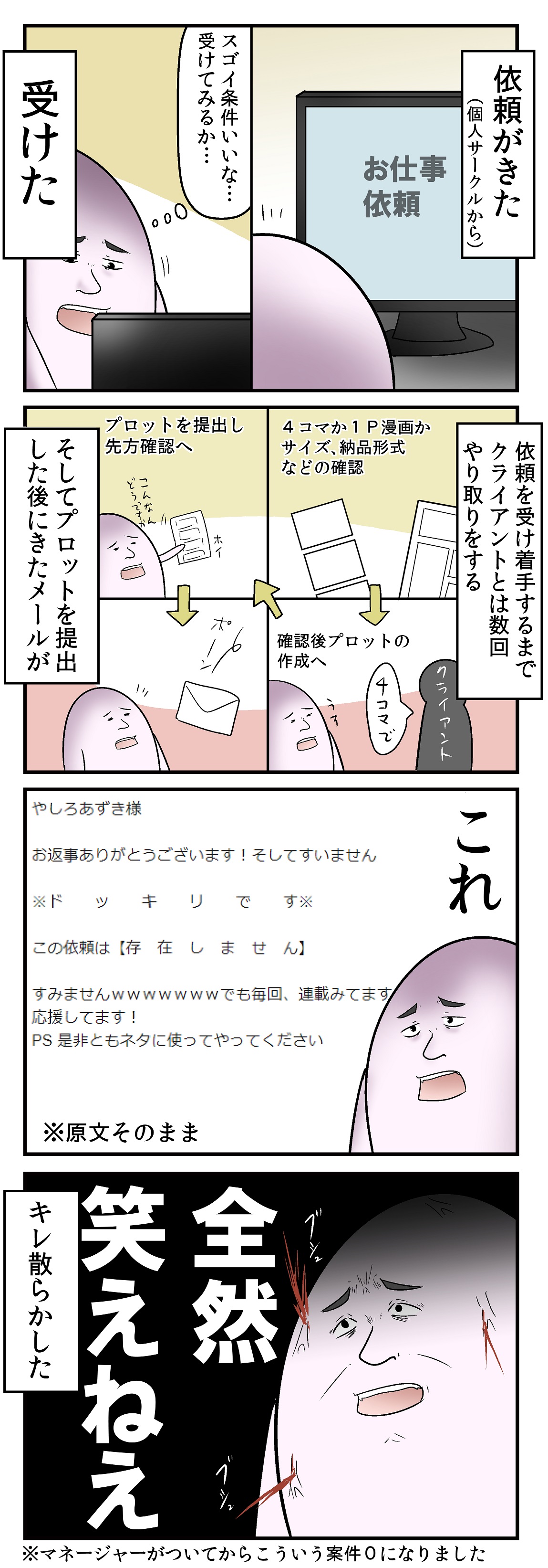 下手したら味しめて他の作家さんのところにも出向いて同じことやりかねないタイプの物件だろ こいつの一件に関わってた時間に、普通の相手から来た別の仕事してればお金になったはずの不利益分を考えたら気の毒以外のなにものでもないです