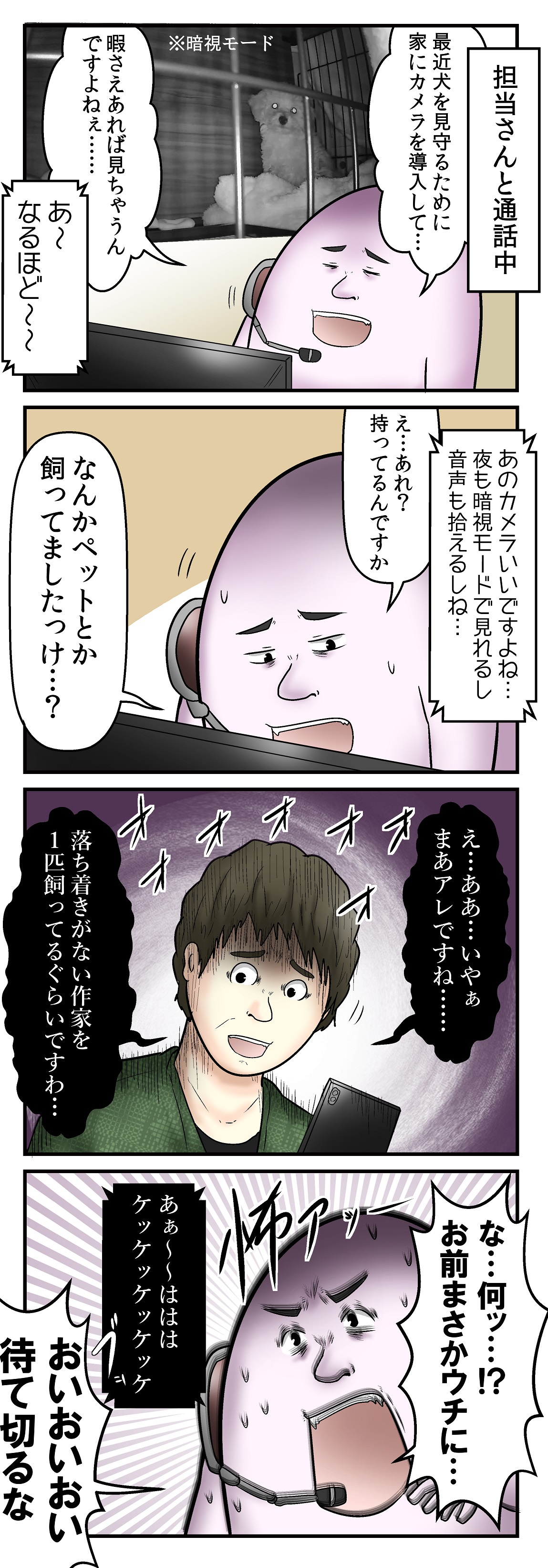 2019年02月21日 僕と担当編集と監視カメラの話 ゲーム始めた瞬間にLINEが来るのはそういう…(本当にしかけられてる訳はない) ☆最近の担当編集の話 僕と担当とスマブラの罠の話 「日常漫画」カテゴリの最新記事 タグ :#やしろあずき#4コマ 前の記事僕と全てを知る獣医さんの話 次の記事僕と母親と過去の隠密行動の話 コメント コメント一覧 (35) 1. 名無しって言う 2019年02月21日 12:02 三角コーンの中に仕掛けられてる説 0 やしろあずき がしました 2. 担当 2019年02月21日 12:03 ずっとあなたの後ろにいたんですよ?気付かなかったんですか? 0 やしろあずき がしました 3. 三角コーン 2019年02月21日 12:04 三角コーンの裏に監視カメラが!!! 0 やしろあずき がしました 4. ななし 2019年02月21日 12:05 実際カラーコーンにGPSでも仕込まれたら家バレるよなぁ 自分で書いててカラーコーンにGPSって意味わかんないけど 0 やしろあずき がしました 32. あべし 2019年03月14日 02:33 >>4 家知らんのにどやって送たん 0 やしろあずき がしました 33. ニート 2019年05月31日 17:02 >>32 裏技があるんやで 0 やしろあずき がしました 5. ななしさん 2019年02月21日 12:07 ”飼う”って表現…コワイ… 0 やしろあずき がしました 6. 名無し 2019年02月21日 12:18 よーく見るとPCやスマホのカメラが起動してたりしませんか…? 0 やしろあずき がしました 7. なー 2019年02月21日 12:39 こわいこわいこわい((( ;゚Д゚)))ガクガクブルブル 0 やしろあずき がしました 8. ななし 2019年02月21日 13:38 本当に仕掛けてたら編集の人を訴えましょう。負担の鬱憤を晴らすように。 0 やしろあずき がしました 9. さ迷うカラーコーン(カメラ内臓) 2019年02月21日 13:44 皆三角コーンにカメラが…って思うんだな。 0 やしろあずき がしました 10. 参画コーン 2019年02月21日 14:05 三角コーン型カメラ発売されたら時事問題になりそうだなぁ〜! 三角コーンなら見知らぬ人から送られてきても違和感ないし、家のそこら中に沢山ある三角コーンの内の1つくらいカメラが内蔵されていても気付かなさそう…… 0 やしろあずき がしました 15. コンポタ 2019年02月21日 14:57 >>10 三角コーンなら見知らぬ人から送られても違和感ない←このブログサイトでしか伝わらない文章 0 やしろあずき がしました 11. オイカタ 2019年02月21日 14:17 犯罪じゃねぇ!? 0 やしろあずき がしました 12. 名無し 2019年02月21日 14:17 画面共有ソフトかなあ 0 やしろあずき がしました 13. ににんが四股。 2019年02月21日 14:19 安心してください。 「ゲームを始めた瞬間にLINEが来る」のではなく、「ゲームを始める瞬間」の頻度が高いのでLINEが来るタイミングとの遭遇率が高くなってるだけですから。 0 やしろあずき がしました 14. !?? 2019年02月21日 14:24 本当に仕掛けていたら犯罪ですよ… \=͟͟͞͞(꒪ᗜ꒪ ‧̣̥̇)/ 0 やしろあずき がしました 16. 2019年02月21日 15:59 木を隠すなら森、カメラを仕掛けるなら三角コーンが自然! 0 やしろあずき がしました 17. じゃがりコーンΔ 2019年02月21日 16:53 今回の担当さんの目が好き 0 やしろあずき がしました 18. 三角コーンの精霊 2019年02月21日 17:32 担当に頼まれてお母さんがエアコンの中に仕込んでましたよ(゜-゜) 0 やしろあずき がしました 19. 橙 2019年02月21日 18:09 何か 本当にありそうな話💦 0 やしろあずき がしました 20. 雷蔵 2019年02月21日 20:42 カメラを仕掛けたり乗っ取ったりしなくても、やしろ先生の周りには居るじゃないですか。 ほら、やしろ先生の為に担当の目としてネタを作ってくれる人が二人も(笑) 0 やしろあずき がしました 21. ななしです 2019年02月22日 05:02 妻と母の目がカメラかもしれませんよ 0 やしろあずき がしました 22. こしあん派 2019年02月22日 06:30 アルテマウエポンちゃんの目から三角コーンへの殺意が迸っている件 0 やしろあずき がしました 23. 2019年02月22日 08:05 やしろ先生->お母様&嫁->編集、のホットラインが出来上がってるに違いない 0 やしろあずき がしました 24. ゴリラ 2019年02月22日 09:35 今更カメラの1台2台仕掛けられたってどうってことないでしょう お母さんと言う最強の監視がいるじゃないですか 0 やしろあずき がしました 25. あ 2019年02月22日 14:04 去り際に屁こいたのかと思った 0 やしろあずき がしました 26. エイデン ピアース 2019年02月22日 15:07 その監視カメラ ハッキングしておいたのさ 0 やしろあずき がしました 27. め 2019年02月22日 16:40 お母様か奥様が担当様にダークザドッグモニターの使い方を教えたとか? でもやしろさん…覚悟して見てる人…ですよね。犬を監視しようとするって事は逆に監視されるかもしれないという危険を常に覚悟している人ってわけですよね… 0 やしろあずき がしました 28. あ 2019年02月22日 18:29 意外と多いのがIDパスワードをデフォルトで使ってて見れちゃう奴 0 やしろあずき がしました 29. 2019年02月22日 18:45 マジな話テロとかであの三角コーンに爆発物が仕込まれたりってのは結構危惧されてる 0 やしろあずき がしました 30. に 2019年02月22日 22:18 世にも奇妙な物語みたいな