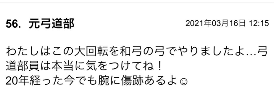 弓を巻き込んで怪我した人、Twitterのほうにも何人か現れてたので割とあるあるなんだろうね。弓道部員気をつけて…