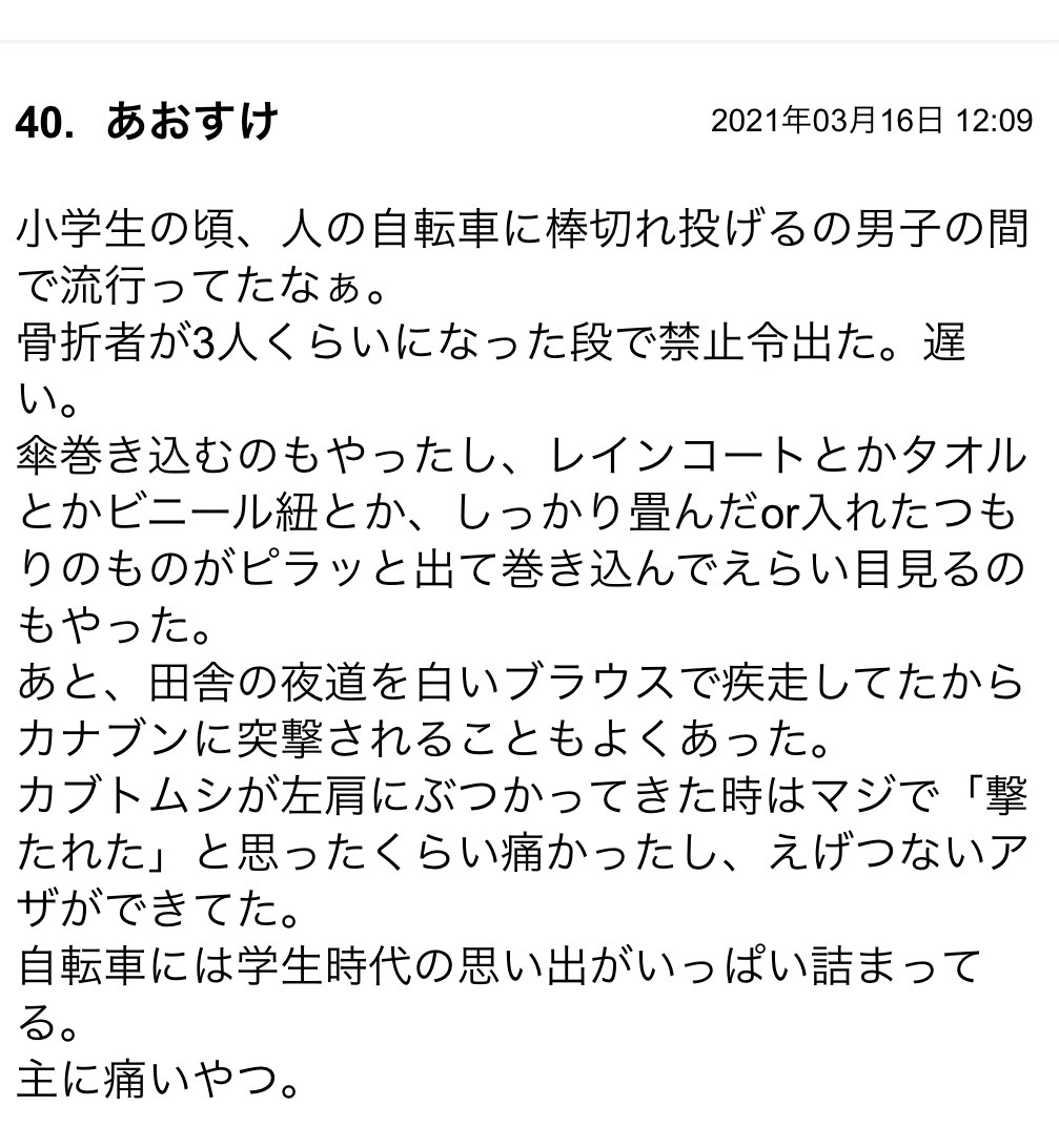 自転車も通れる歩道を我が物顔で走ってる自転車を見ると苛立つのですが、棒を車輪に投げ込めばいいんですね!(もちろん本当にはやりません)