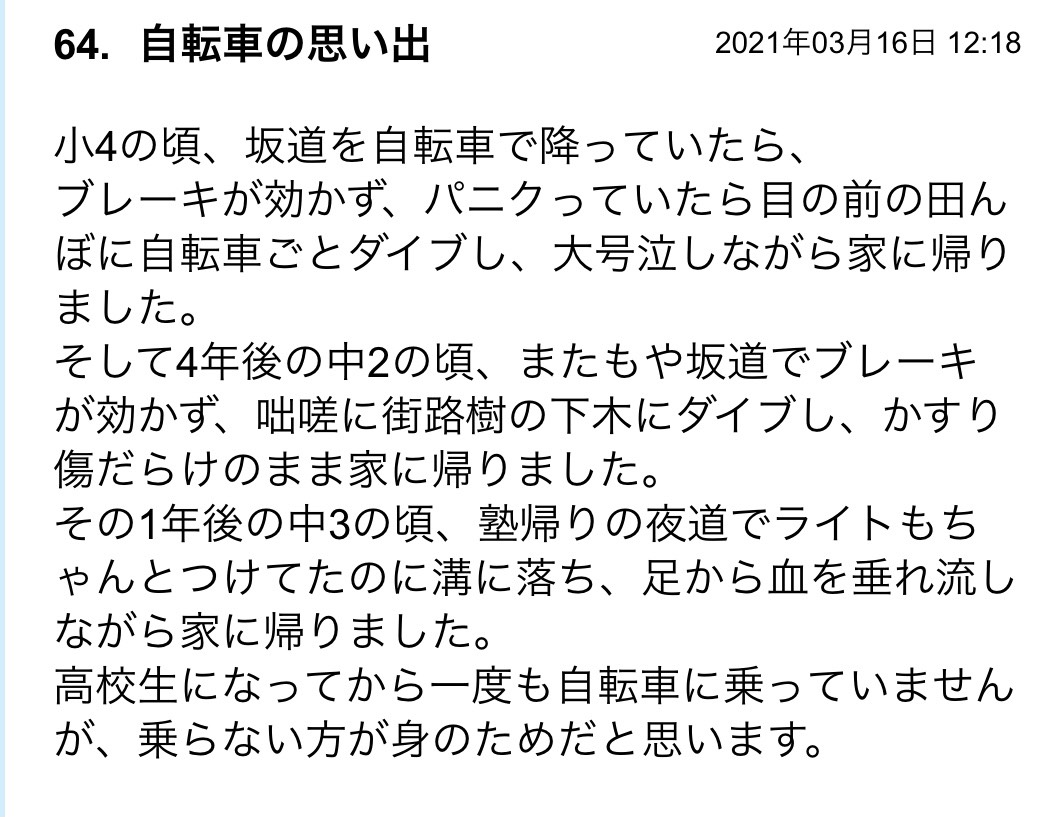 車引かれなかったしコケもしなかったから五体満足だけど…結局は本人の自覚と運だよね…こういうのって