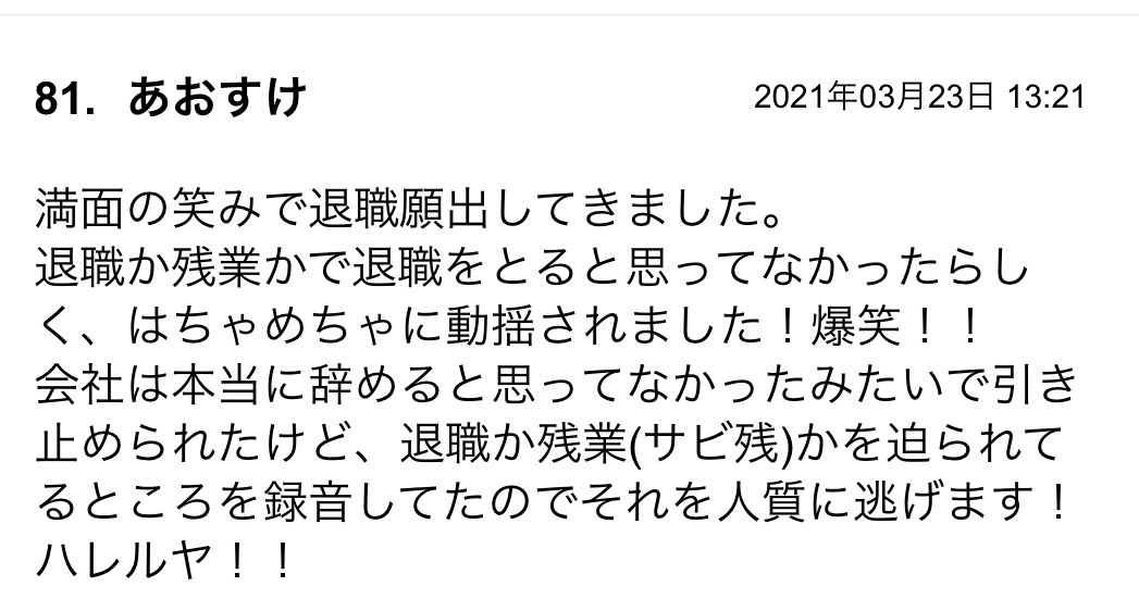 しっかり録音とかもしてるっぽいので安心できそうだけど、何があるかわからないのがブラック企業のこわいとこ!気を引きしめて辞めような!