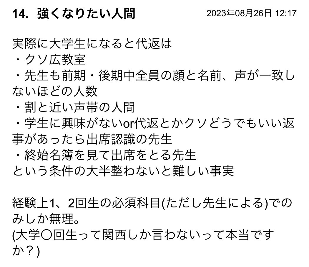 マジモンの代返、見てみたい。あと~回生は確かに言わない。意味はわかるけど。