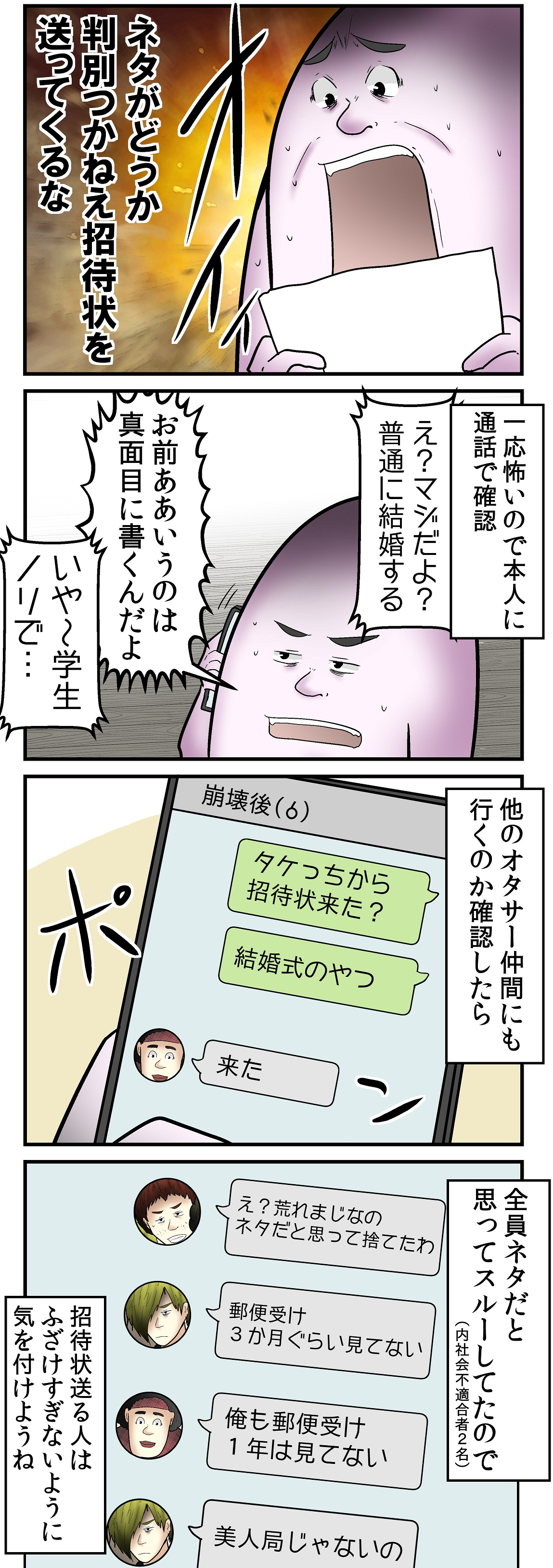 ところで身内や高校の時の同級生が結婚するととんでもなくダメージ負うよな。こないだそれを初体験したカキコ