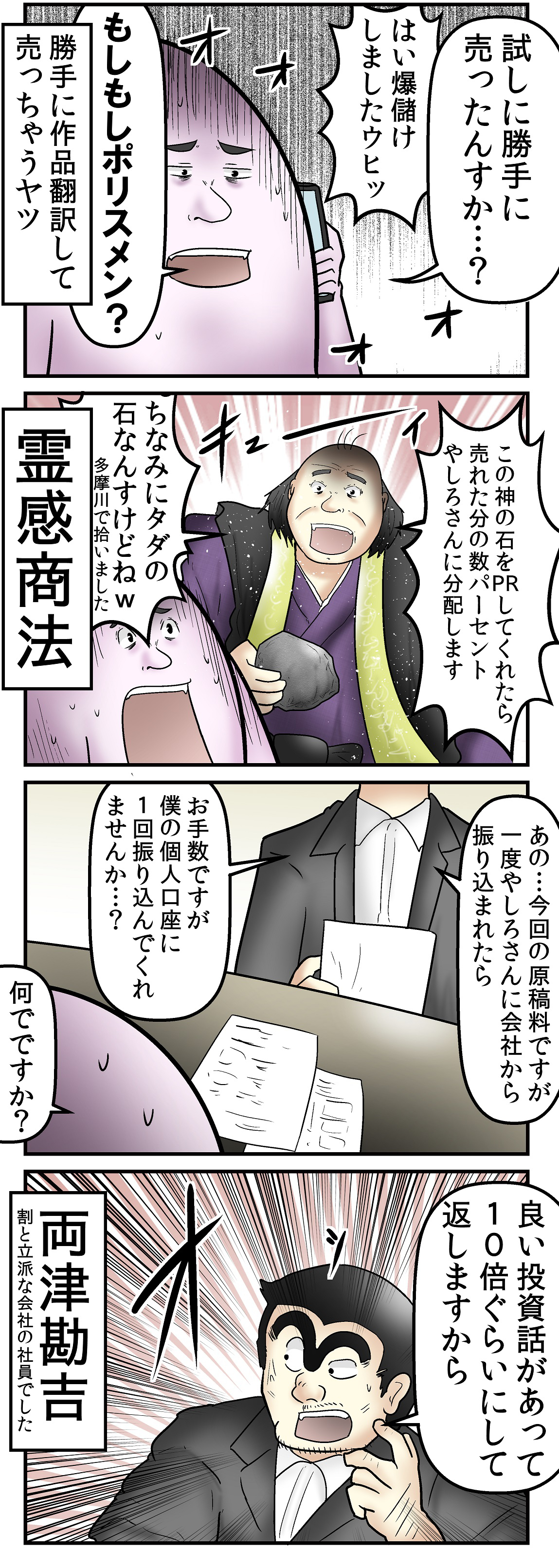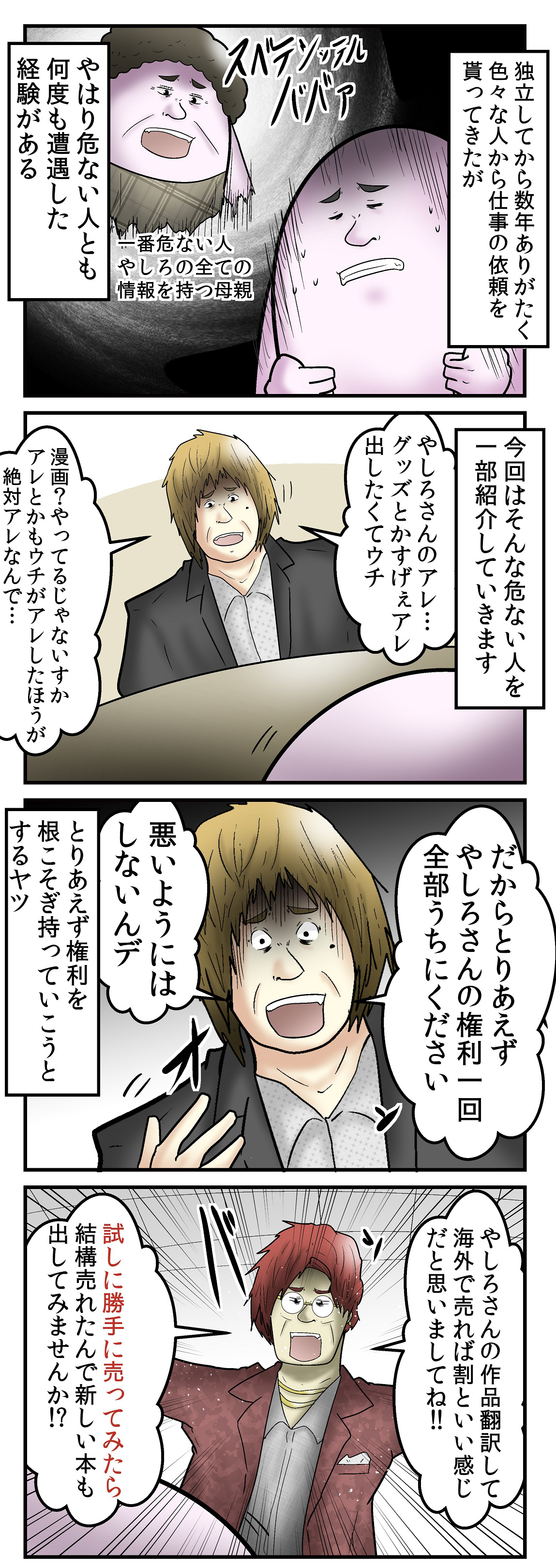素人からしたら霊感商法が一番やばい気がするけど漫画家さんからしたらやっぱ権利を根刮ぎ持っていこうとする奴が一番やばいんやろなぁ