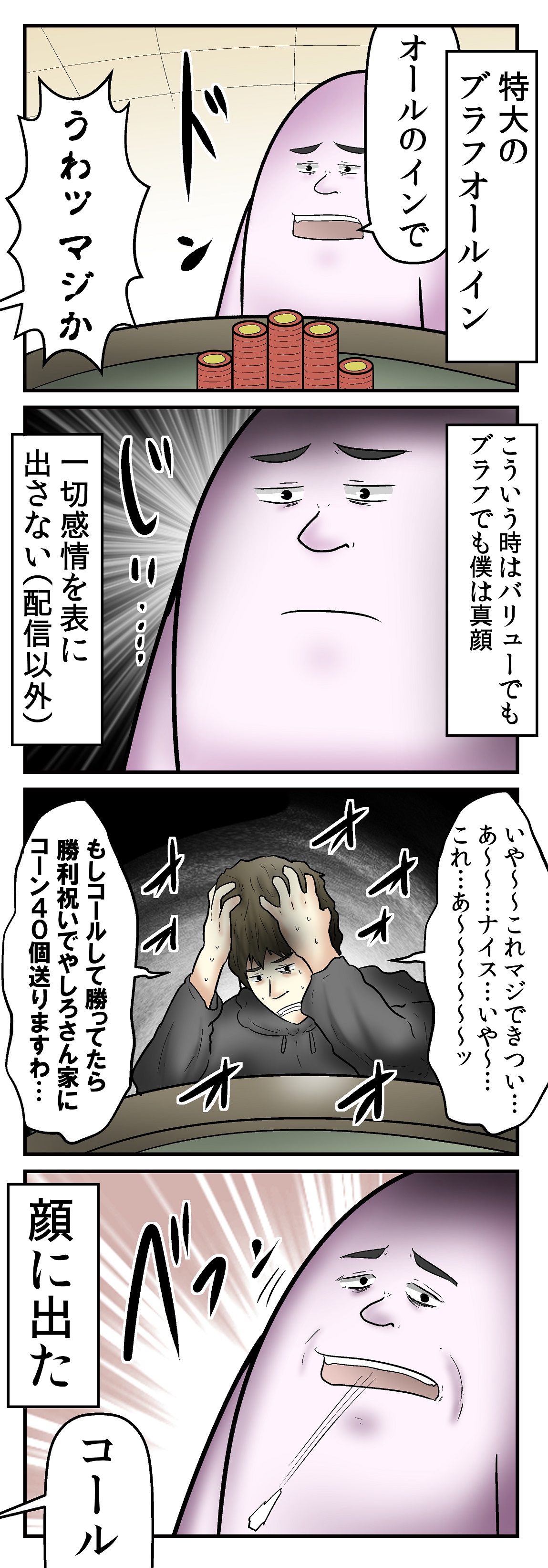 ポーカーにおいて、実際には弱い手札であるが、手持ちのチップ全てを賭けることで相手に「強い手札に違いない」と思い込ませること。