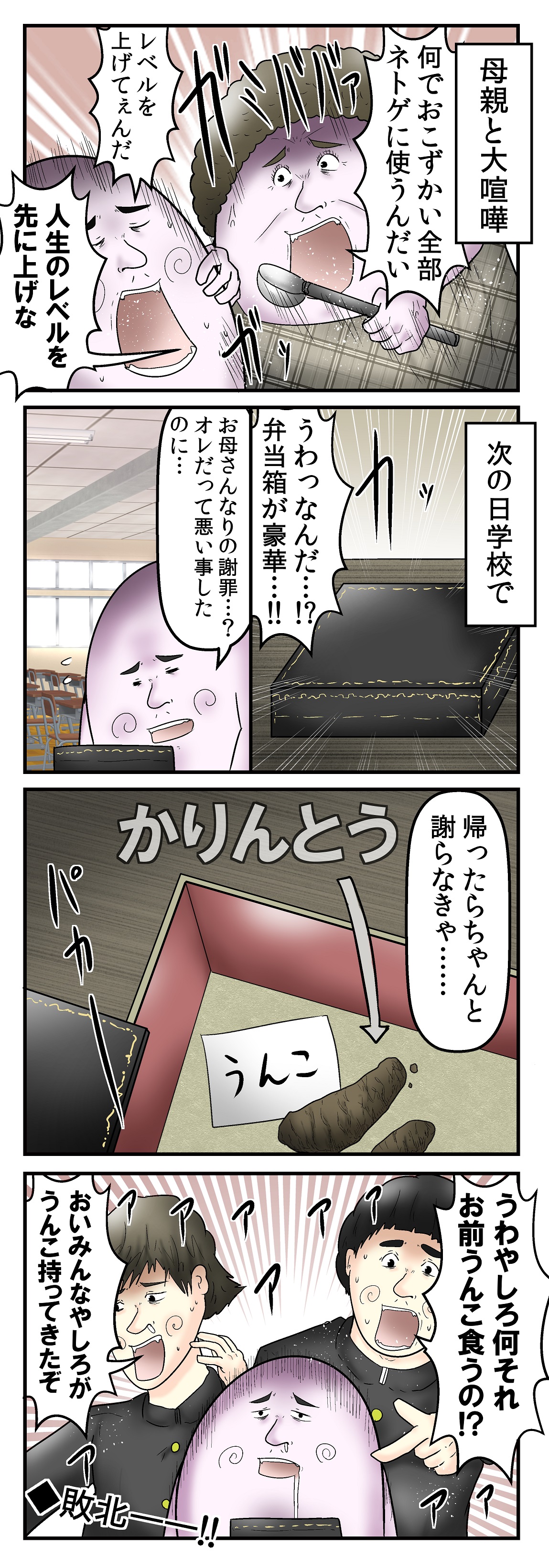 2018年04月26日 母親とお弁当の話 この日から一週間、弁当うんこマンと呼ばれました。訴訟。 「ババアと家族漫画」カテゴリの最新記事 タグ :#やしろあずき#4コマ漫画 前の記事絵を描く際の値段交渉の話 次の記事我が家の門限の話 コメント コメント一覧 (18) 1. しゃみゆ 2018年04月26日 12:01 あるあるですねw ここまでのやつはなかったけど母親ならではの制裁みたいなのありましたわwww 2. ゆみさ 2018年04月26日 18:15 素晴らしいお母様(*’ω’ノノ゙☆パチパチ 私もこんな母になりたいです❗ やしろさんが羨ましい❗ 3. ちゃ~ら~♪へっちゃら~♪ 2018年04月26日 19:39 いやホントお母さん最高すぎない?www 4. ゆー 2018年04月27日 21:35 噴いたw やしろさんの母ちゃん大好きです!\(^o^)/ 5. 卍ドュルりゅう卍 2018年12月14日 10:03 同じ事やる親もいるんだな🤔 6. ななし 2019年01月21日 10:06 人生のレベルアップすこ 7. 名無し 2019年01月22日 20:40 ありました、うちは喧嘩とかではなく 蓋を開けたら500円 えーそりゃもうダッシュしました 8. 名無し 2019年02月26日 00:22 この感性が凄いw 9. 名無し 2019年02月27日 17:15 めちゃ爆笑してしまいましたwww 10. ナナシ 2019年04月08日 19:11 1コマ目から母ちゃんが言ってる事がご最もで草 11. DAN蜜 2019年04月08日 21:50 「人生のレベルを先に上げな!」 鋭いつっこみに感動 12. ナードファゴット 2019年04月08日 22:05 ネトゲという事は、「レベル上げが金次第」というソシャゲの事でしょうか? 「先に大金を突っ込んだ後は時間をかけてレベルを上げるか自分自身のゲームの腕前を上げる」というタイプなら「小遣いじゃなくて時間」ですしね。 言っておきますが「自分のゲームの腕を磨いている」なんて言いませんよ。精々「最近の若い子はネットで資料が手に入るから図書館に行かなくてもいいんだね、まして身銭を切って自分専用資料を買うなんてありえないよね」と言うだけです。 13. きなこ 2019年04月09日 14:12 で、うんこくったの? 14. ぱん2 2019年06月16日 05:41 経験値一定時間割合上昇アイテムに使うとして、一体いくら使ったやら。 15. mm 2019年12月21日 17:00 真っ向から正論を偽善的にかざして怒るのではなく、 ユーモアあふれる「実感させる育児」が上手で惚れますw 16. うんk 2020年03月27日 12:11 昼飯時にうんこの話は確実に女子に嫌われるぞ 17. 3265 2020年03月27日 15:41 人生のレベルアップ…全くです! 頑張ります!! 名前はゲームのレベル。 18. 高台のゴリラ 2020年08月05日 12:46 討鬼伝買ってきて、PS4を押し入れから出す時に、「ウッヒョオォぉぉ!久しぶりにゲーム(据え置き型)やるぜぇぇぇ!」とテンションあがってたら 手を滑らせて落としてしまい その音に驚いたオヤジが部屋に飛び込んできて PS4を踏みつけ、なんか壊れたので 7月に続き、色々ついてない今月に 凹むゴリラ… コメントフォーム 名前 コメント 記事の評価 リセット リセット 顔 星 情報を記憶 コメントを投稿する
